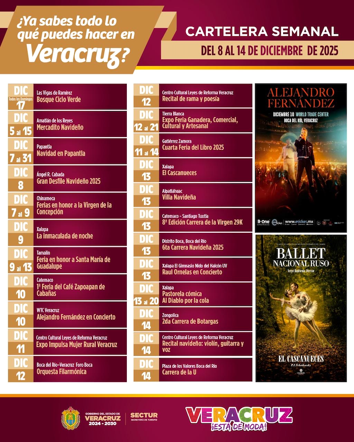 El 10 de diciembre, Catemaco será sede de la PrimeraFeria del Café Zaopapan de Cabañas, donde las personas visitantes podrán conocer el trabajo de productores locales y disfrutar de degustaciones y experiencias sensoriales; también ese día, el World Trade Center Veracruz recibirá al reconocido cantante Alejandro Fernández, uno de los espectáculos más esperados del mes por su impacto turístico en la región.