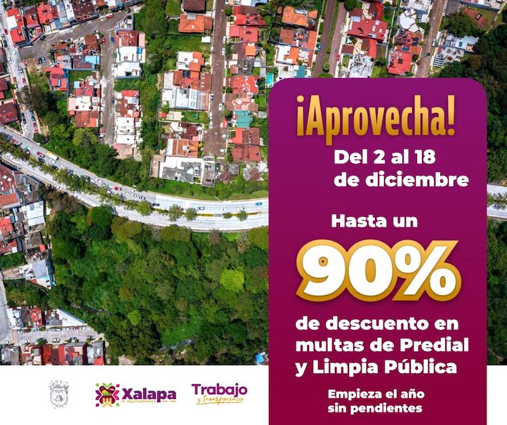 Xalapa, Ver., 16 Diciembre 2025.- Con el fin de contribuir a que la ciudadanía se ponga al corriente en sus contribuciones, el programa de descuentos de hasta 90 por ciento en multas del Predial y Limpia Pública se extiende hasta el jueves 18 diciembre.