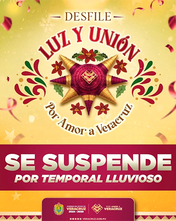 Xalapa, Ver., 19 Diciembre 2025.- Debido al temporal lluvioso registrado en la ciudad, se suspende el desfile navideño Luz y Unión, a fin de proteger la integridad de las y los participantes, así como del público asistente. El evento será reprogramado para el Día de Reyes.