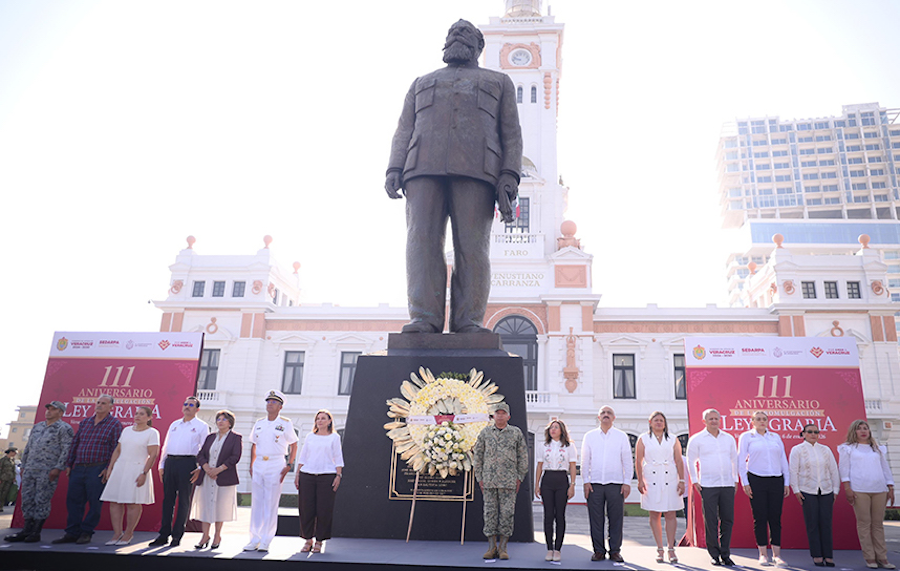 Veracruz, Ver., 06 Enero 2026.- Con una guardia de honor y el depósito de ofrenda floral ante el monumento a Venustiano Carranza, la gobernadora Rocío Nahle García, junto con autoridades de los tres órdenes de gobierno, conmemoró el 111 aniversario de la promulgación de la Ley Agraria.