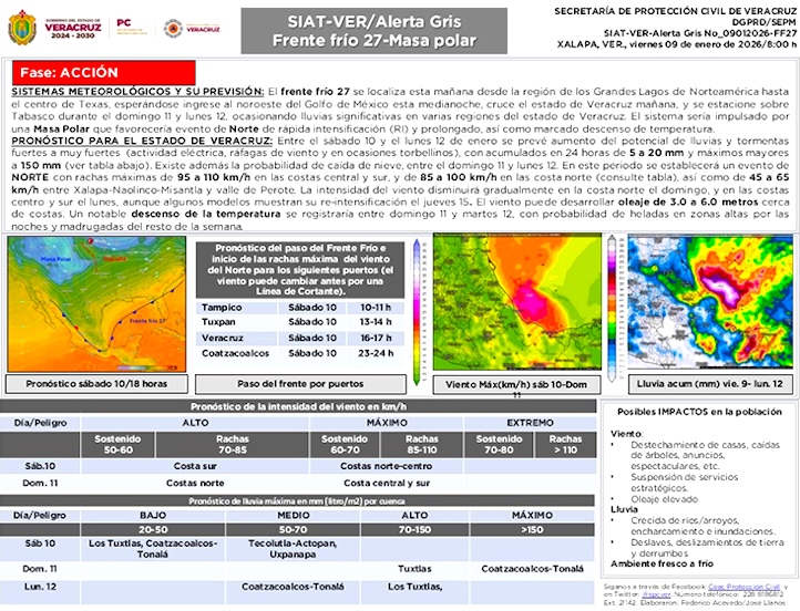 Xalapa, Ver., 09 Enero 2026.- La Secretaría de Protección Civil (PC) emitió la Alerta Gris ante la probabilidad de efectos asociados al evento de Norte y al Frente Frío número 27, los cuales impactarán al territorio veracruzano a partir de este sábado 10 de enero.