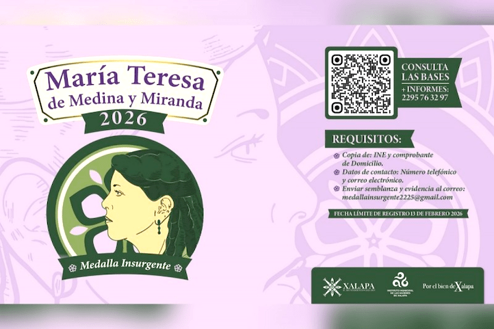Se cierra el 13 de febrero: IMMX Xalapa, Ver., 19 Enero 2026.- Con el fin de reconocer la trayectoria y trabajo en favor de la igualdad de género, la promoción y la defensa de los derechos de las mujeres, el Ayuntamiento, a través del Instituto Municipal de las Mujeres de Xalapa (IMMX), invita a la ciudadanía a participar en la convocatoria de la medalla insurgente … Continúa leyendo Ayuntamiento convoca a la medalla María Teresa de Medina y Miranda