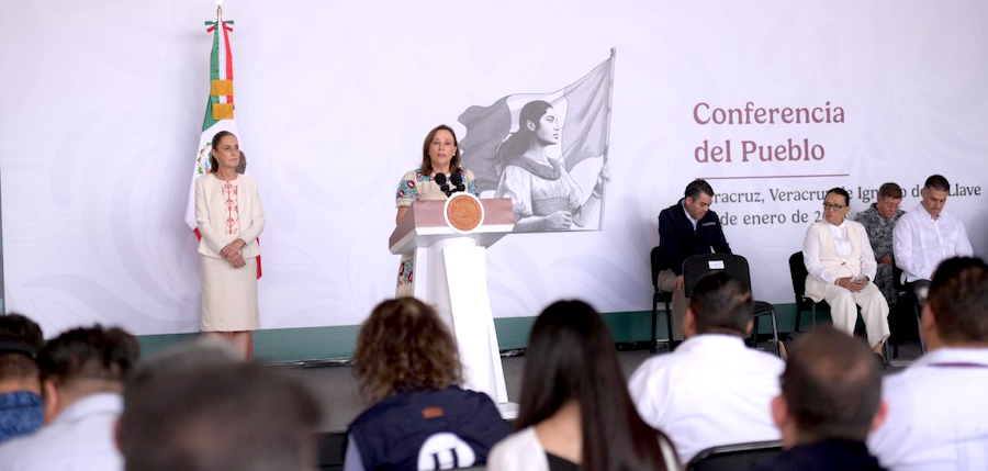 Veracruz, Ver., 23 Enero 2026.- Durante la Conferencia del Pueblo realizada en la Base Aeronaval de Veracruz, la gobernadora Rocío Nahle García dio la bienvenida a la presidenta Claudia Sheinbaum Pardo y a las y los integrantes del Gabinete de Seguridad, y refrendó la coordinación entre los gobiernos federal y estatal, luego de la sesión previa para evaluar los índices delictivos.