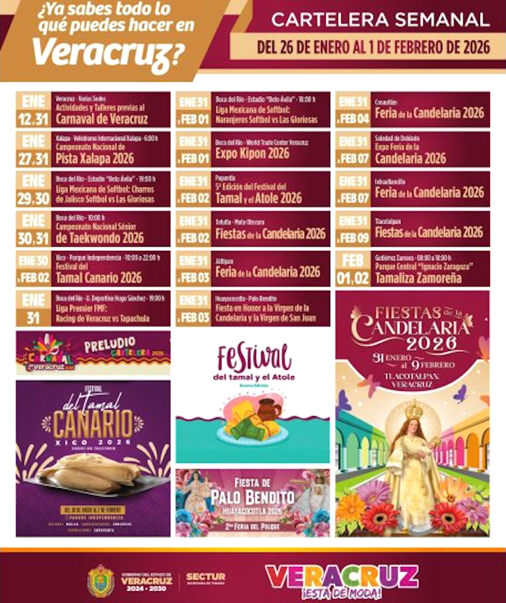 Xalapa, Ver., 27 Enero 2026.- La Secretaría de Turismo (SECTUR) te invita a recorrer Veracruz y disfrutar de una amplia cartelera de actividades hasta el 01 de febrero, con experiencias que combinan tradición, gastronomía, deporte y entretenimiento.