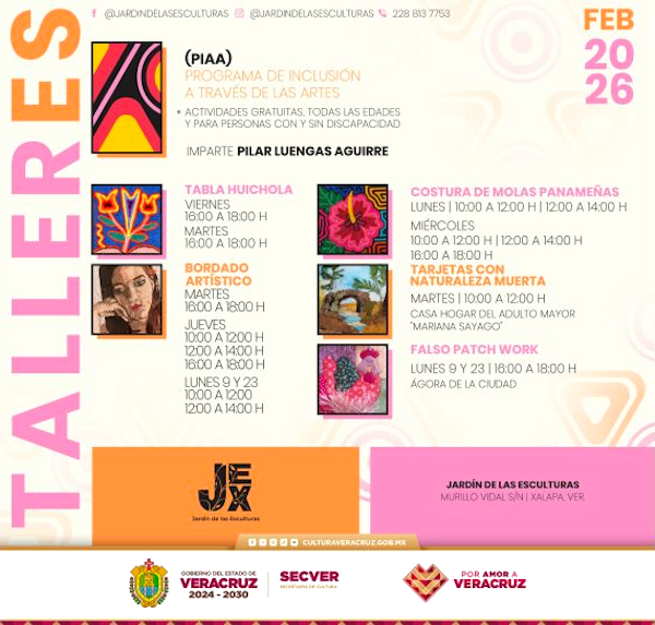 Xalapa, Ver., 04 Febrero 2026.- La Secretaría de Cultura de Veracruz (SECVER), mediante el Programa de Inclusión a través de las Artes (PIAA), invita al público en general a participar en los talleres inclusivos que tendrán lugar durante el presente mes en el Jardín de las Esculturas de Xalapa (JEX), cuya entrada es libre.