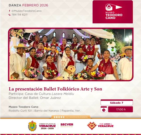 Xalapa, Ver., 06 Febrero 2026.- La Secretaría de Cultura de Veracruz (SECVER) invita al público en general a asistir a la exhibición de danza del Ballet Folklórico Arte y Son que se llevará a cabo el día sábado 07 de febrero, a las 17:00 horas, en el Museo Teodoro Cano, en Papantla. La entrada es libre.