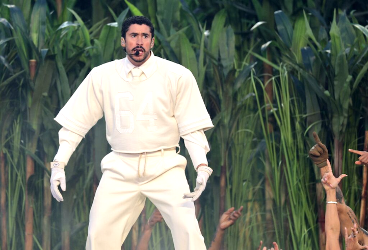 El ‘conejo malo’ abría el escenario del evento deportivo más visto de EE.UU. con el éxito ‘Tití me preguntó’, vestido con un traje blanco que simulaba una equipación de fútbol americano y cargando bajo el brazo un balón de fútbol.