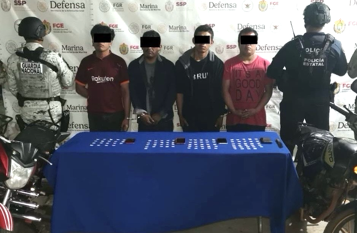 Por delitos contra la salud, 18 personas fueron detenidas; se les aseguraron 228 dosis y 15 gramos de una sustancia con características del cristal, 33 dosis y 38 gramos de presunta marihuana, así como celulares, tres réplicas de arma de fuego, chalecos tácticos, un automóvil y cinco motocicletas sin reporte.