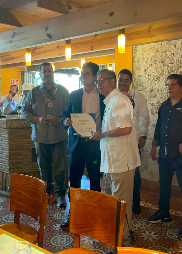En la cordial reunión a la que acudieron invitados por Andrade Sánchez, director ejecutivo de la cadena Restaurant Finca Don Marco, el presidente de Skal Veracruz entregó un reconocimiento al capitán del servicio restaurantero Alberto Colorado, a través del alcalde Ignacio Luna, por su atención, diligencia y disposición para formar servidores turísticos profesionales dentro del ramo.