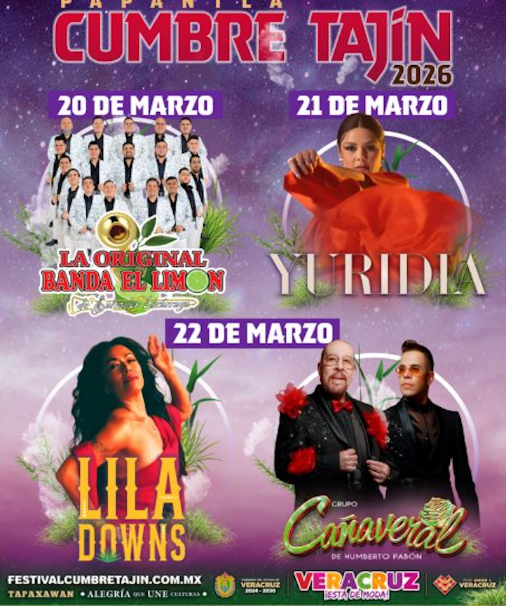 Xalapa, Ver., 26 Febrero 2026.- La espera terminó, la gobernadora Rocío Nahle García anunció la cartelera oficial de Cumbre Tajín 2026, del 20 al 22 de marzo en el majestuoso municipio de Papantla, corazón del pueblo totonaco y símbolo vivo de raíces ancestrales.