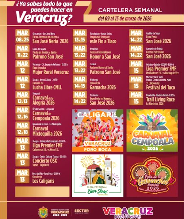 Xalapa, Ver., 10 Marzo 2026.- La Secretaría de Turismo (SECTUR) invita a la ciudadanía y a visitantes a disfrutar de la cartelera semanal de actividades que se realizarán en distintas regiones, con festividades patronales, carnavales, conciertos, eventos deportivos y encuentros gastronómicos que reflejan la diversidad cultural y turística de Veracruz.