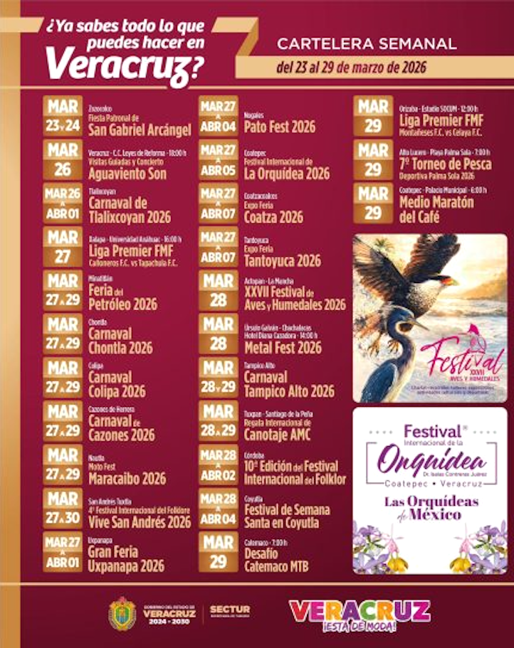 Xalapa, Ver., 25 Marzo 2026.- La Secretaría de Turismo (Sectur) invita a disfrutar de la agenda de actividades que se llevarán a cabo del 26 al 29 de marzo en distintos municipios de Veracruz, con una amplia oferta de eventos culturales, deportivos, gastronómicos y tradicionales.