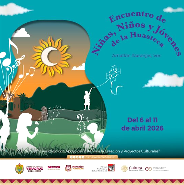 Naranjos Amatlán, Ver., 02 Abril 2026.- La Secretaría de Cultura de Veracruz (Secver) invita al Encuentro de Niñas, Niños y Jóvenes de la Huasteca, del 06 al 11 de abril en el municipio de Naranjos Amatlán. La entrada es libre.