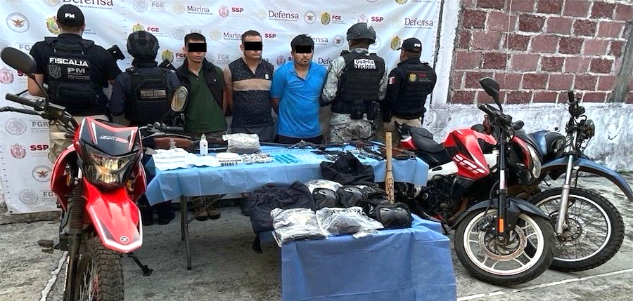 Asimismo, se aseguraron tres armas de fuego cortas, una larga y una réplica, cartuchos útiles, cargadores, un arma blanca y equipamiento táctico; además de celulares, básculas, pipas y cinco motocicletas, dos con el NIV alterado y tres sin reporte de robo.