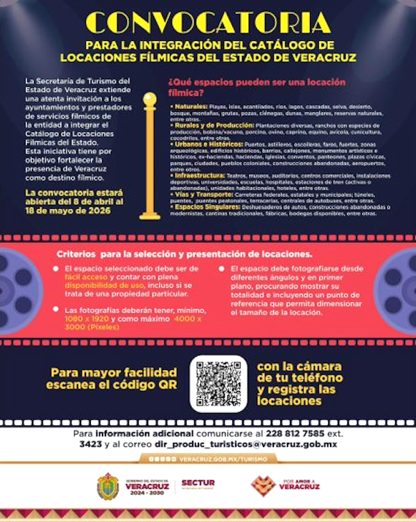 Las personas interesadas podrán realizar su registro a través del código QR disponible en la convocatoria, o consultar más información al teléfono 228 812 75 85, extensión 3423, o al correo electrónico dir_produc_turisticos@veracruz.gob.mx.