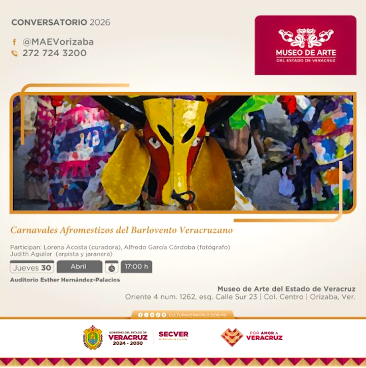 Xalapa, Ver., 28 Abril 2026.- La Secretaría de Cultura de Veracruz invita a conocer la exposición Carnavales afromestizos del Barlovento veracruzano, del 30 de abril al 30 de agosto en la Sala Permanente de Arte Popular del Museo de Arte del Estado de Veracruz (MAEV), en Orizaba, de martes a domingo, en horario de 9:30 a 18:00 horas. La entrada es gratuita.