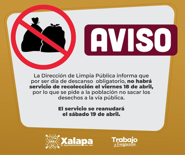Xalapa, Ver., 17 de abril de 2025.- Por ser día de descanso obligatorio, el viernes 18 de abril no habrá servicio de recolección de desechos urbanos, informó la Dirección de Limpia Pública. La dependencia exhorta a la población a no sacar los residuos a la vía pública, con el fin de mantener la buena imagen urbana y evitar problemas de contaminación. El servicio se reanudará … Continúa leyendo Hoy viernes suspenden servicio de limpia pública