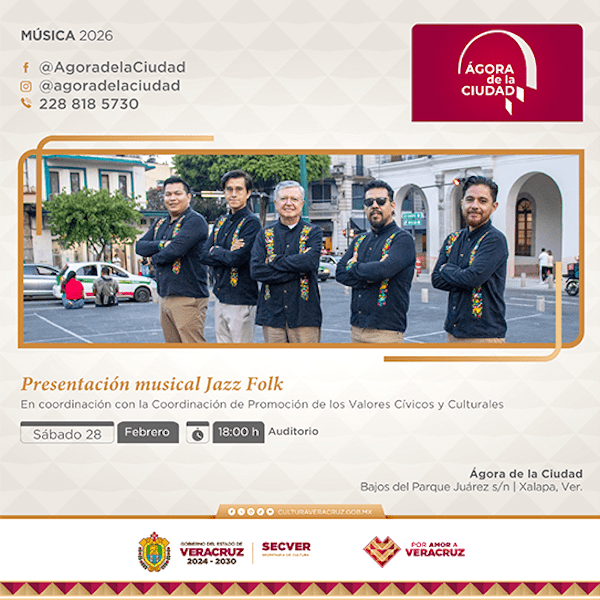 Xalapa, Ver., 26 Febrero 2026.- La Secretaría de Cultura de Veracruz, en colaboración con la Coordinación de Promoción de los Valores Cívicos y Culturales de la Secretaría de Gobierno, invita al concierto gratuito de la agrupación Jazz Folk, el sábado 28 a las 18:00 horas, en el Auditorio del Ágora de la Ciudad. Contará con la participación especial de la cantante Messe Merari, quien presentará … Continúa leyendo Invita Secver a presentación de Jazz Folk en el Ágora