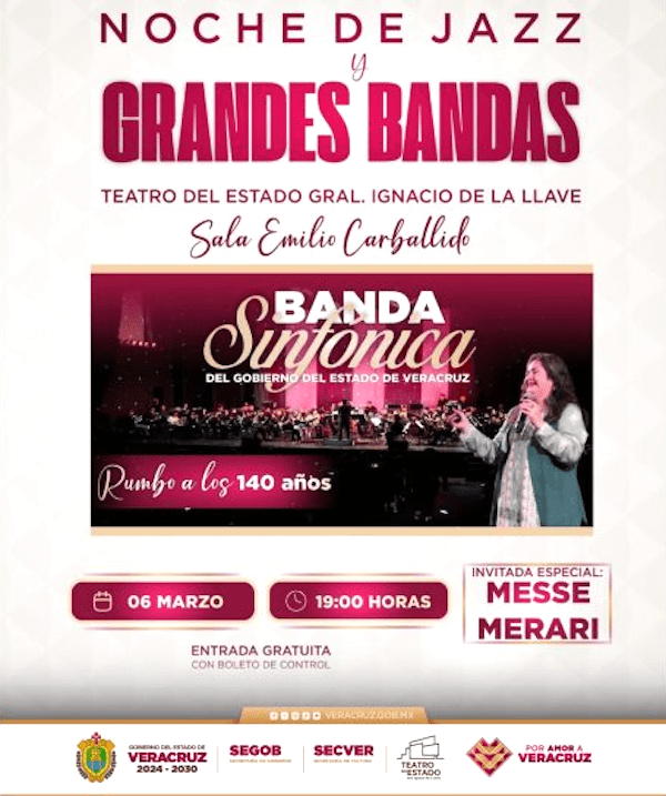 Xalapa, Ver., 04 Marzo 2026.- La Secretaría de Cultura de Veracruz, en colaboración con la Coordinación de Valores Cívicos y Culturales de la Secretaría de Gobierno, invita al Concierto Noche de Jazz y Grandes Bandas, a cargo de la Banda Sinfónica del Gobierno del Estado de Veracruz, el viernes 06 de marzo, a las 19:00 horas, en la Sala Emilio Carballido del Teatro del Estado General … Continúa leyendo Segob y Secver invitan a Noche de Jazz, en la sala Carballido, mañana