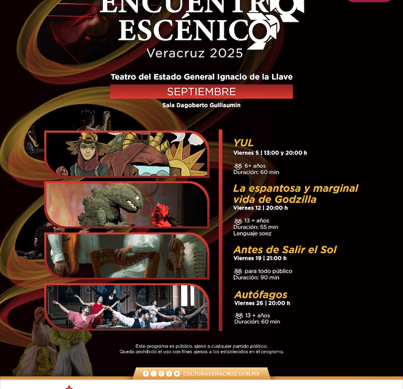 Xalapa, Ver., 04 de septiembre de 2025.- Durante el mes de septiembre, la Secretaría de Cultura de Veracruz (SECVER) invita a asistir a las presentaciones del Encuentro Escénico Veracruz (EEV) 2025, a través de cuatro puestas en escena en la Sala Emilio Carballido del Teatro del Estado. Son aptas para todo el público. Este viernes 05, en funciones de 13:00 y 20:00 horas, se presentará … Continúa leyendo Secver invita a Encuentro Escénico Veracruz en el Teatro del Estado